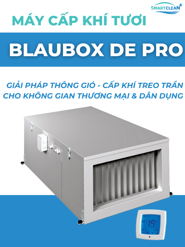 Máy cấp khí tươi BLAUBOX DE PRO là thiết bị thông gió cấp khí treo trần từ thương hiệu Blauberg (Đức), được thiết kế để cung cấp không khí tươi sạch vào các không gian nội thất. Thiết bị trang bị quạt ly tâm cao áp, bộ gia nhiệt điện tích hợp và bộ lọc G4, giúp loại bỏ bụi bẩn và làm ấm không khí khi cần thiết. Vỏ máy làm từ tấm aluzinc hai lớp, cách nhiệt và cách âm bằng lớp len khoáng 50 mm, đảm bảo độ bền và hoạt động êm ái. Sản phẩm tương thích với ống gió hình chữ nhật kích thước 400×200 mm, 500×300 mm và 600×350 mm, với lưu lượng gió tối đa lên đến 3350 m³/h (931 l/s). Dòng sản phẩm bao gồm các model: BLAUBOX DE 1300-12 Pro, DE 2500-18 Pro và DE 3300-21 Pro.