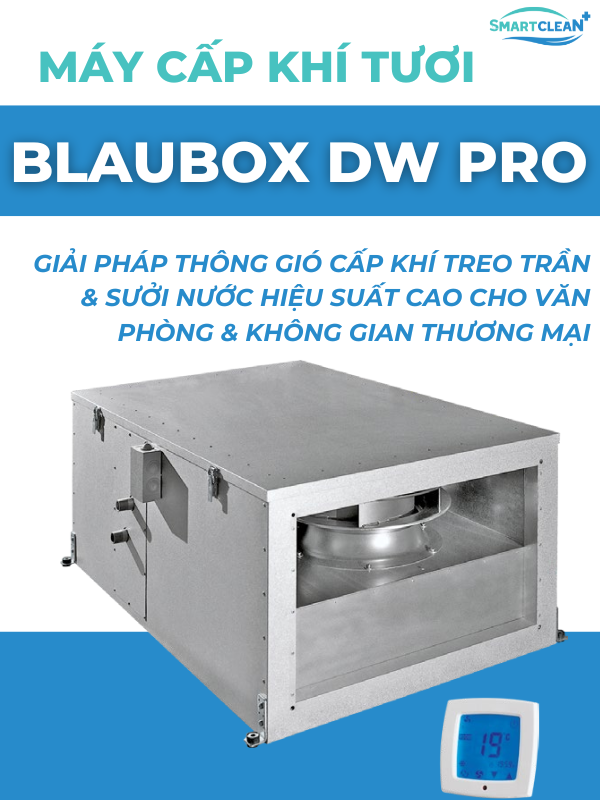 Máy cấp khí tươi BLAUBOX DW PRO là thiết bị thông gió cấp khí treo trần, được chế tạo từ vỏ kép bằng tấm aluzinc, bên trong lót lớp len khoáng dày 50 mm để cách nhiệt và cách âm hiệu quả. Thiết bị có các giá đỡ cố định kèm bộ giảm rung để lắp đặt dễ dàng. Bảng điều khiển có bản lề giúp dễ dàng tiếp cận bên trong để vệ sinh, thay thế bộ lọc và bảo dưỡng. Sản phẩm tương thích với các ống gió hình chữ nhật kích thước 400×200 mm, 500×300 mm và 600×350 mm. Lưu lượng gió lên đến 3260 m³/h (906 l/s), phù hợp cho các không gian lớn. Dòng sản phẩm bao gồm các model: BLAUBOX DW 1200-4 Pro, BLAUBOX DW 2300-4 Pro và BLAUBOX DW 3200-4 Pro.